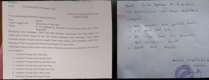 Sementara Pemohon pembuatan SKT Buk. Susi ” Kami berharap sekali Bapak Camat Pondok Kubang yang baru ini segera menandatangani SKT yang sudah kami antarkan dokumen nya dibuat oleh Kepala Desa Taba Jambu dan berkas yang kami lampirkan tersebut sudah memenuhi syarat prosedur sebagian untuk membuat SKT sesuai praturan yang berlaku”Jelas Susi