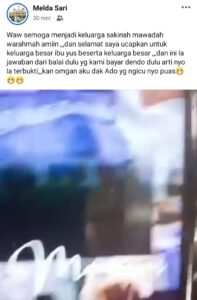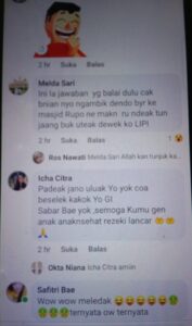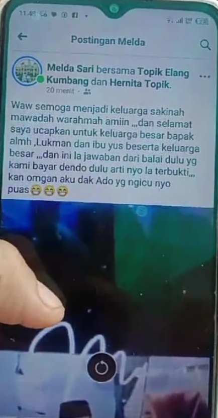 lanjut,LP .Mengenai potingan di branda itu bukan tentang saya dan suami saya.tapi ada prihal lain yang mengakibatkan kami harus tepung stawar di kantor desa dulu.mereka sempat mempitna saya memnggugurkan kandungan namun tudingan itu tidak terbukti sama sekali hingga kini.maka demikian kami di urus di balai desa tabarenah dulu akibat ula mulut nya MD dan OT yang mempitna saya..Dan pada hari kambali terulang lagi pencemaran nama baik atas nama saya dan kelurga besar saya.maka saya hari ini mengambil keputusan akan melaporkan mereka ke pihak APH kabupaten rejang lebong..tutur LP