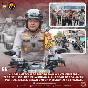 Kapolres Pelabuhan Makassar AKBP Restu Wijayanto mengatakan, pihaknya melakukan patroli skala besar bersama TNI, Yakni Kodim dan Koramil dengan melibatkan babinkamtibmas dan babinsa. Hal ini dilaksanakan sebagai kegiatan iambangan jelang H-1 pelantikan Presiden dan Wakil presiden terpilih.