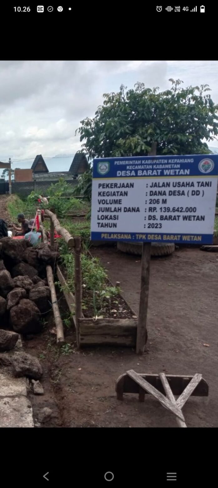Kami selakuh masyarakat sangat menyakan kejadian tidak sesuai dangan musyawarah desa barat wetan yang di gelar di balai desa,barat wetan sementara sumber dana tersebut dari dana desa DD,dan ADD, banyak modus yang di lakukan kepala desa demi merai keuntungan pribadi. Tegas masyarakat.