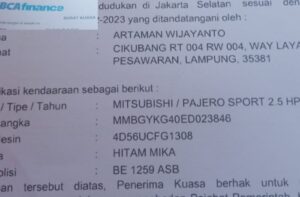 Infoombbsiberindonesia.com Bengkulu Utara – Satu unit mobil Pajero sport warna hitam Mika bernopol BE 1259 ASB dengan nomor rangka MMBGYKG40ED023846 yang masih dalam proses Kredit di salah satu perusahaan pembiayaan PT. BCA FINANCE cabang Lampung atas nama inisial A diduga digelapkan dan diperjual belikan (7/8/2025)