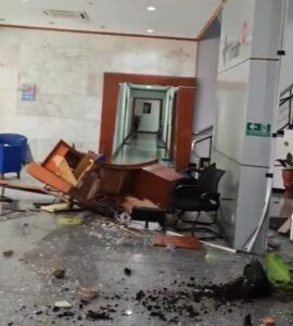 Tidak berhenti di situ, pagar besi di depan kantor pun roboh, diikuti aksi perusakan terhadap bagian lobi utama gedung.