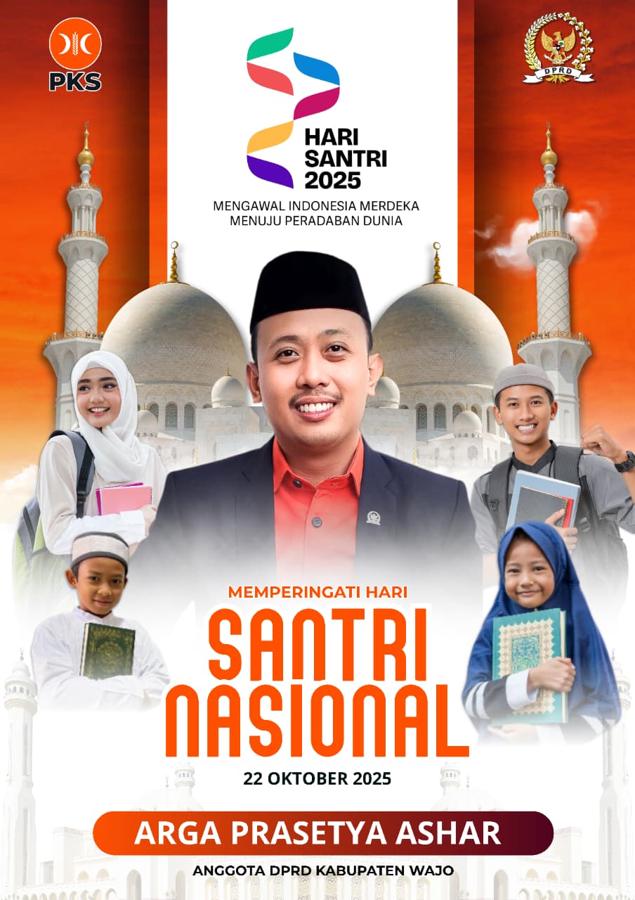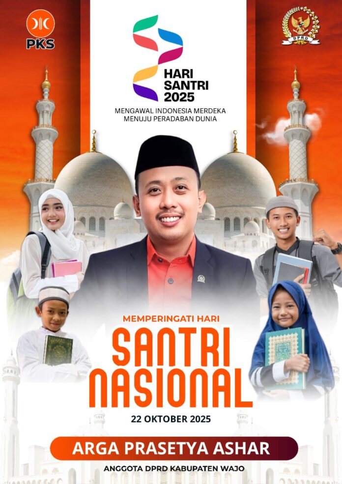 Infoombbsiberindonesia.com ,wajo– Dalam momentum Hari Santri Nasional 2025 yang jatuh pada 22 Oktober 2025, Arga Prasetya Ashar, anggota DPRD Kabupaten Wajo dari Partai Keadilan Sejahtera (PKS), menyampaikan pesan semangat untuk seluruh santri di Indonesia, khususnya yang ada di Kabupaten Wajo.