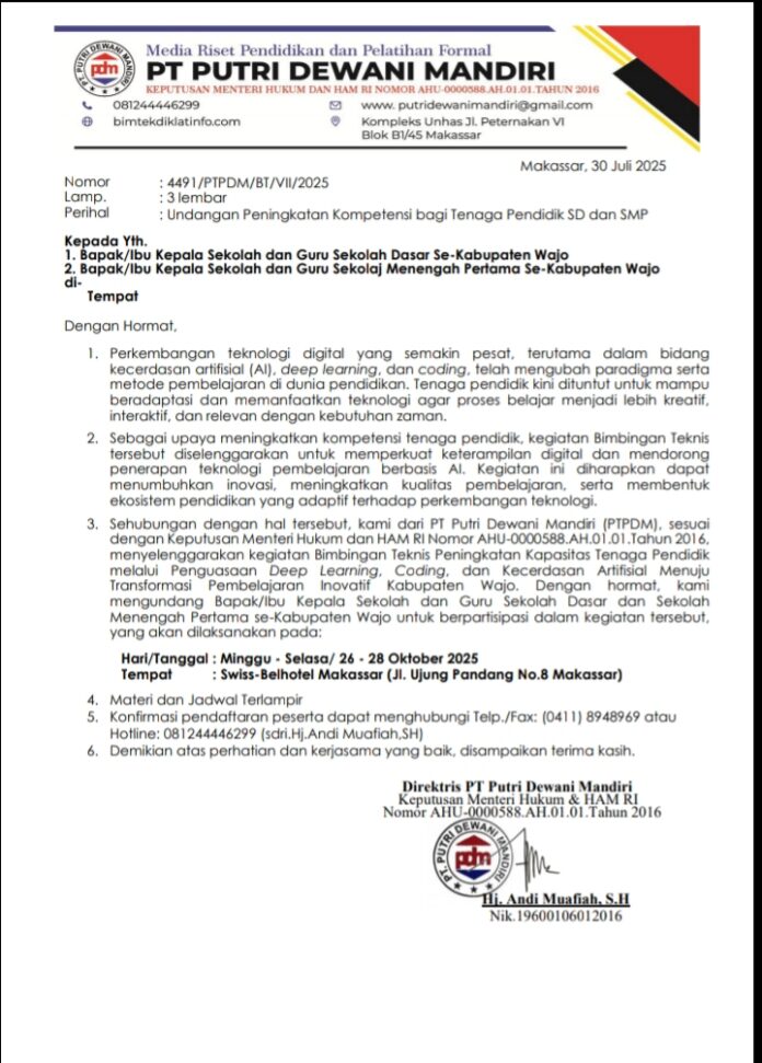 Surat undangan resmi dari PT Putri Dewani Mandiri yang diterbitkan pada 30 Juli 2025 dan ditujukan kepada kepala sekolah SD-SMP, se-Kabupaten Wajo, mencantumkan biaya partisipasi sebesar Rp 4.500.000 per peserta.