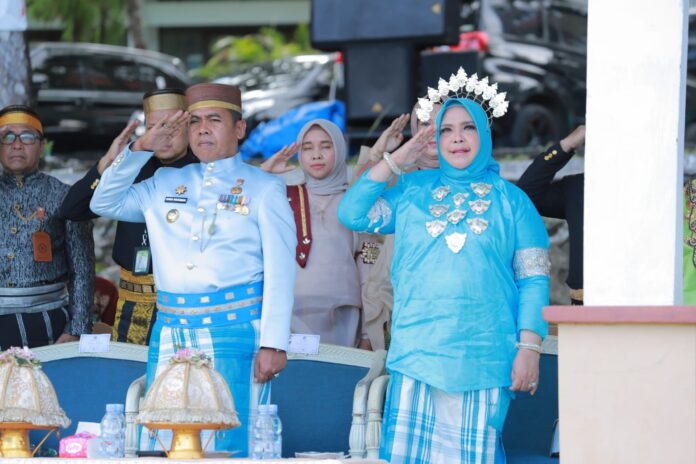 Bupati Wajo, H. Andi Rosman, S.E., bersama Wakil Bupati dr. Baso Rahmanuddin, Sp.PD., tampil kompak mengenakan pakaian adat Bugis berwarna biru tua — melambangkan keteguhan dan keharmonisan kepemimpinan daerah. Hampir seluruh peserta upacara juga mengenakan busana adat dari berbagai daerah Nusantara, menjadikan lapangan kantor bupati tampak semarak dengan ragam warna dan budaya Indonesia.