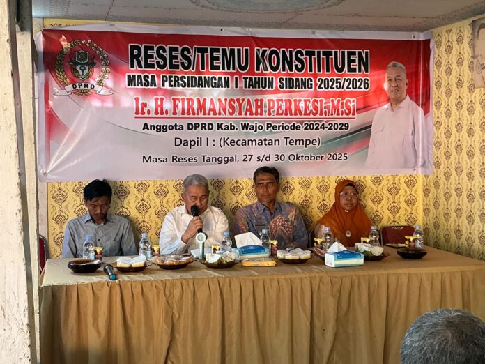 InfoombbsiberIndonesia,com-WAJO – Ketua DPRD Kabupaten Wajo, H. Firmansyah Perkesi, kembali turun langsung menemui masyarakat dalam masa resesnya. Kali ini, politisi Partai Gerindra itu menyambangi warga Jalan Bhayangkara, Kelurahan Paduppa, Kecamatan Tempe, pada Kamis (30/10/2025).