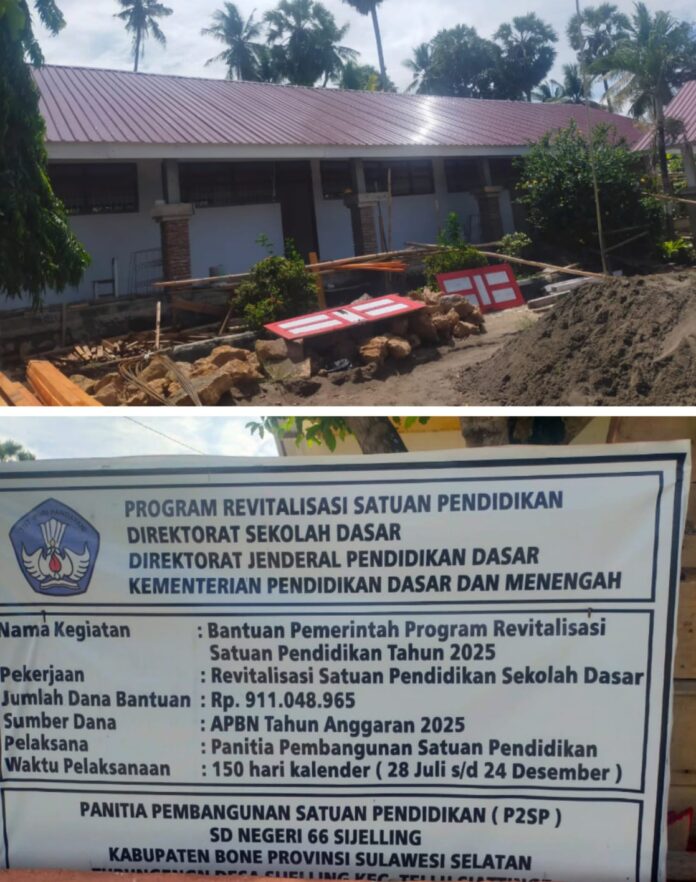 Infoombbsiberindonesia.com-Bone Proyek revitalisasi Sekolah Dasar Negeri 66 Sijelling adalah program pembangunan dan rehabilitasi tahun 2025. Proyek ini merupakan bagian dari Program Revitalisasi Satuan Pendidikan dan dikelola oleh kepala sekolah dan membentuk panitia revitalisasi, konsultan pengawas, dan konsultan perencana, dengan pengawasan berjenjang dari pusat untuk memastikan kelancaran dan mutu pelaksanaan. Tujuannya adalah menciptakan sarana prasarana yang representatif dan aman untuk mendukung peningkatan mutu pembelajaran.
