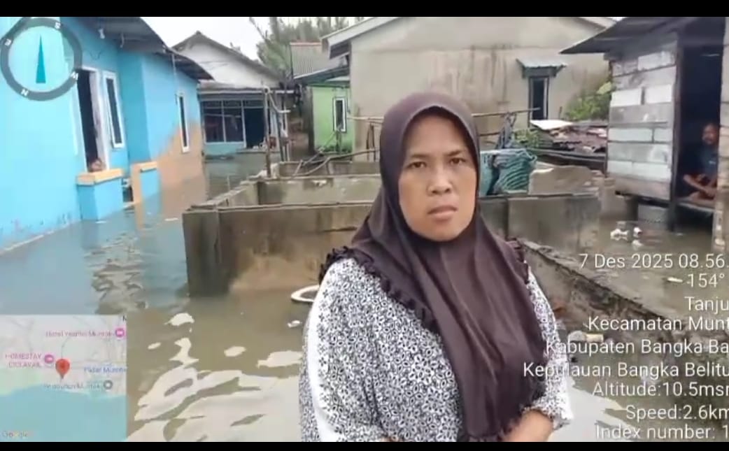 MENTOK, BANGKA BARAT — Genangan banjir setinggi hampir setengah meter kembali merendam pemukiman padat di Kampung Tanjung, Kecamatan Mentok, pada Minggu (7/12/2025) pagi. Air bercampur sedimen berwarna cokelat susu itu naik cepat dari bibir laut, meluber ke lorong-lorong sempit lalu masuk ke rumah-rumah warga, memaksa aktivitas berhenti dan menambah panjang daftar banjir rutin yang tak kunjung berakhir.
