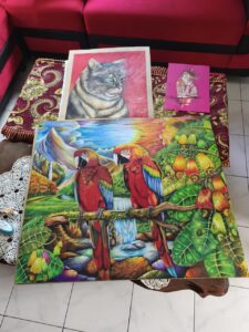 Ia tidak membatasi seni pada medium tertentu. Selain kanvas dan karton, dinding rumah pun ia jadikan media berkarya. Di sudut garasi, masih terlihat lukisan hitam-putih air terjun malam yang digoreskan langsung di tembok sebuah simbol bahwa seni tidak menunggu kondisi ideal.